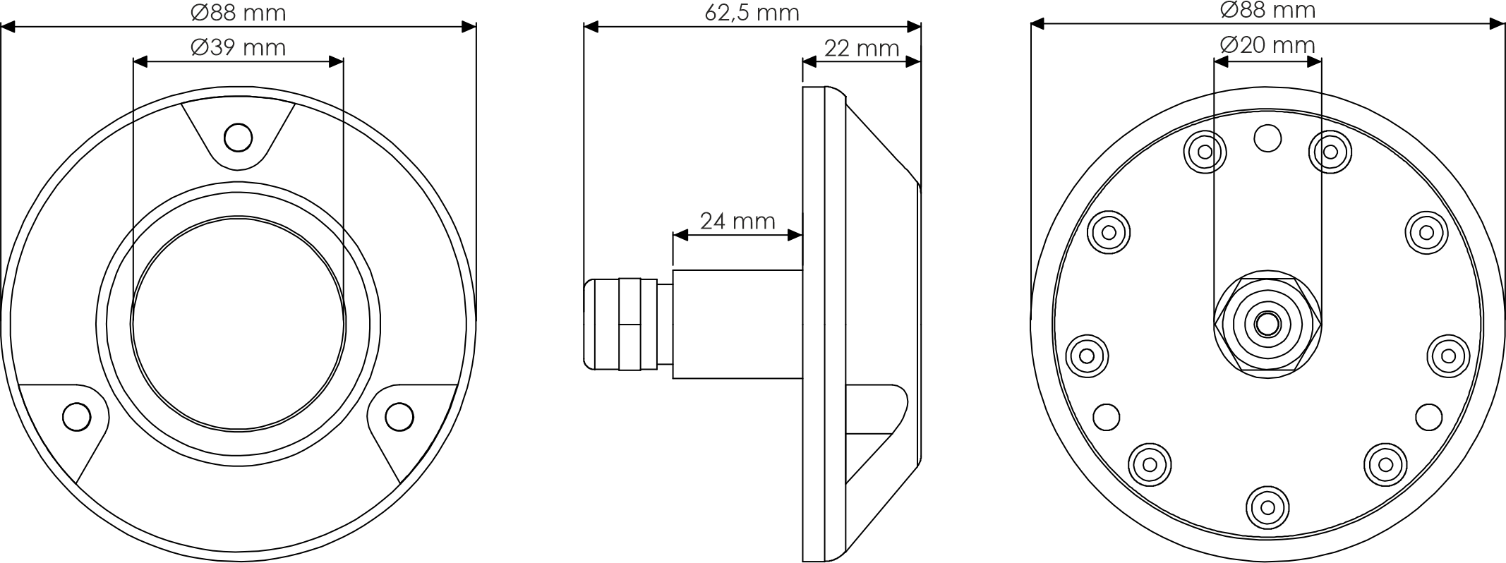 | Ürün Ölçüleri | Işık Kafa Çapı: 88mm. , Kafa yüksekliği: 22mm. , Tam Boy: 62,5mm. , Cam çapı: 39mm. | |